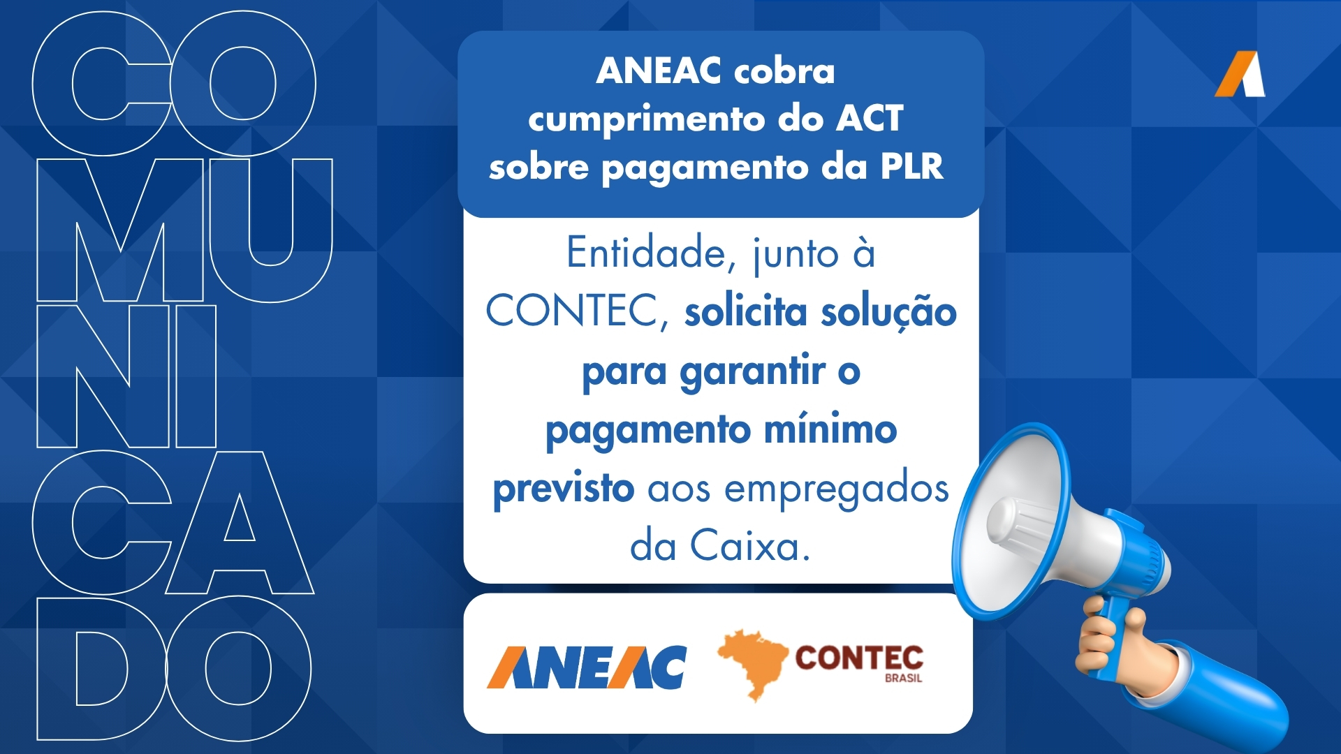 A ANEAC, em conjunto com a CONTEC e outras entidades representativas dos empregados da Caixa Econômica Federal, encaminhou ofício ao presidente da instituição, Carlos Antônio Vieira Fernandes, solicitando providências em relação ao cumprimento de cláusula do Acordo Coletivo de Trabalho (ACT) 2024/2025, especialmente no que diz respeito à distribuição da Participação nos Lucros e Resultados (PLR).